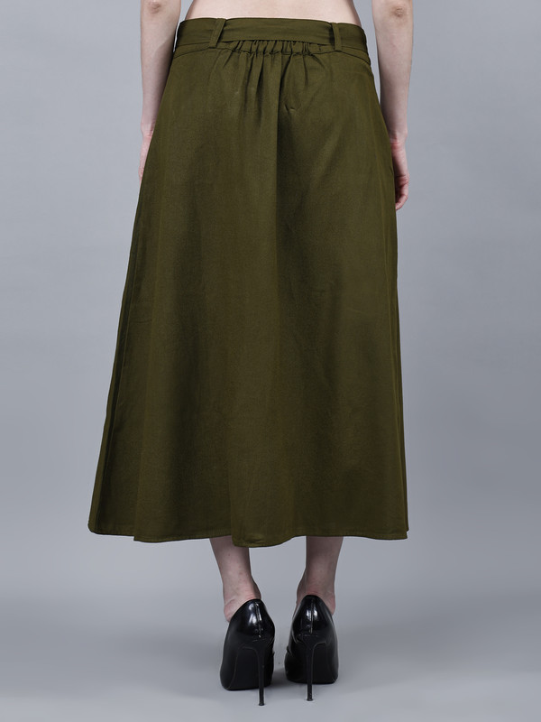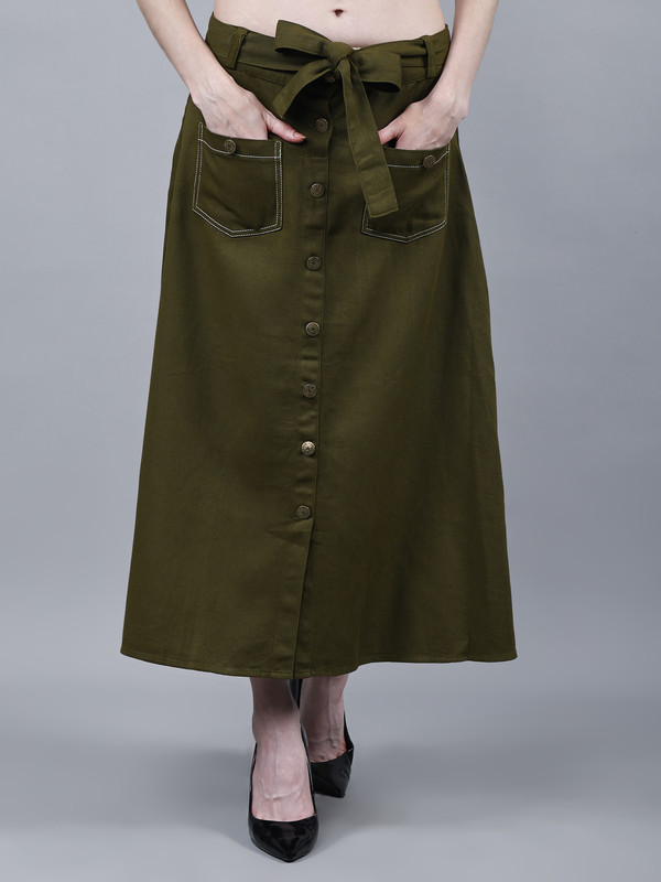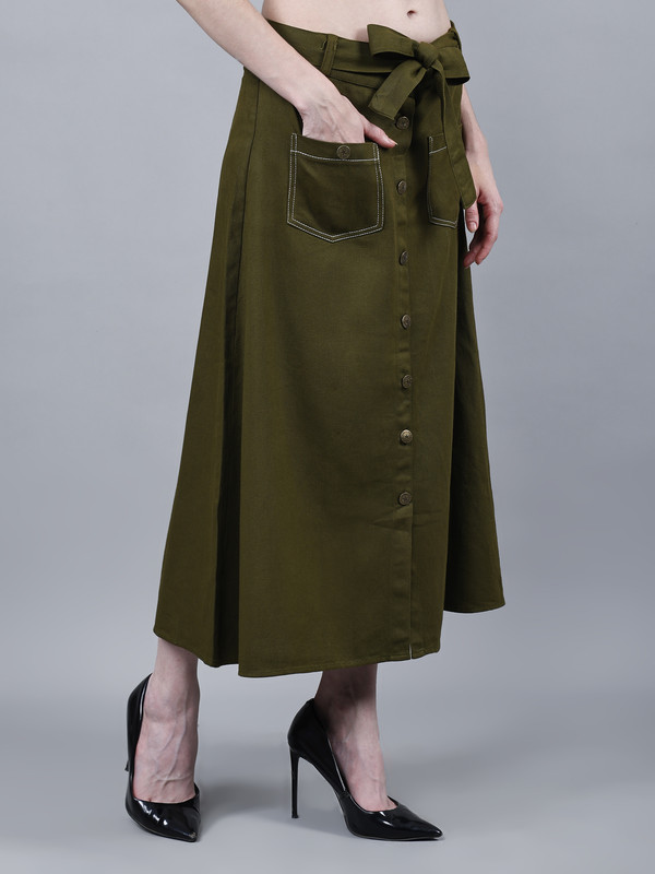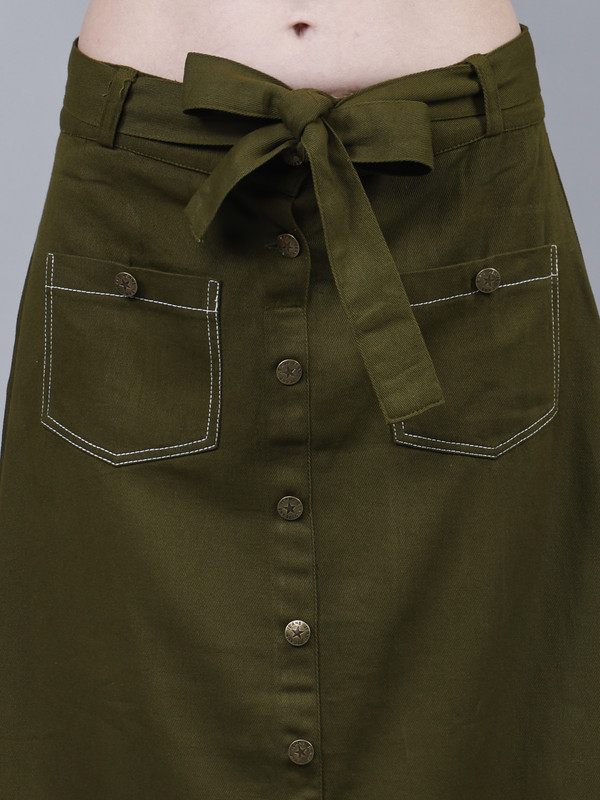 Solid midi A-line Green Cotton skirt for Women, has a partially elasticated waistband, front slit, button closure, 2 front patch pockets, comes with a belt. Washed Premium Quality Denim.