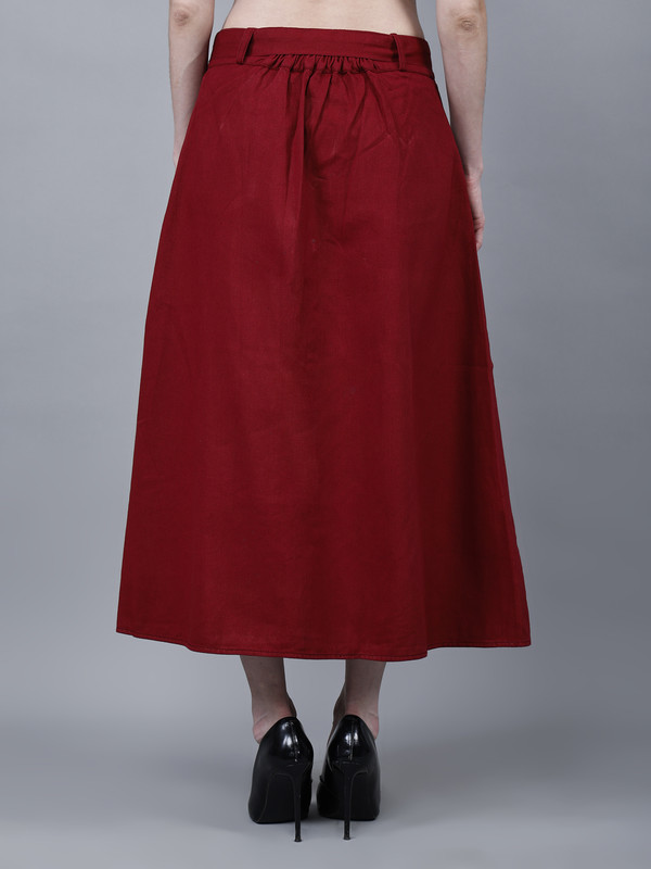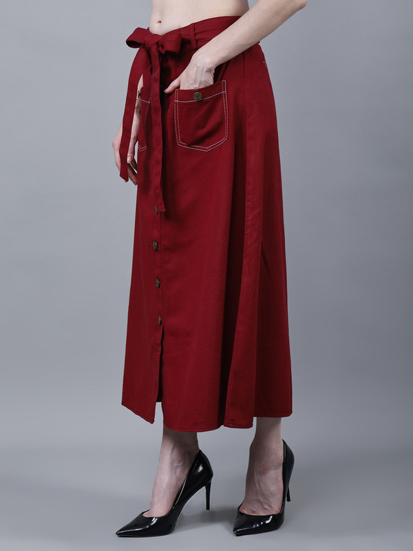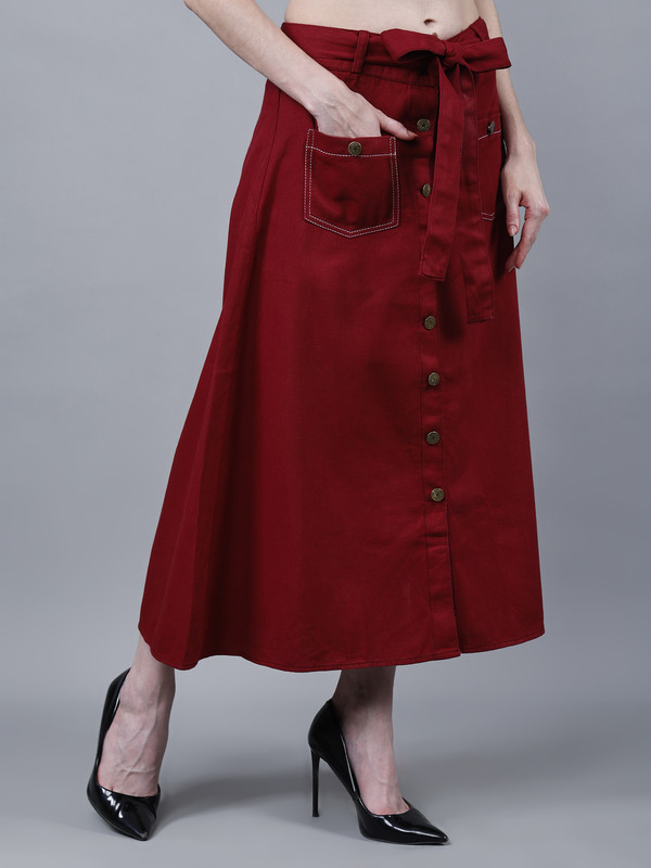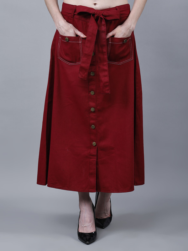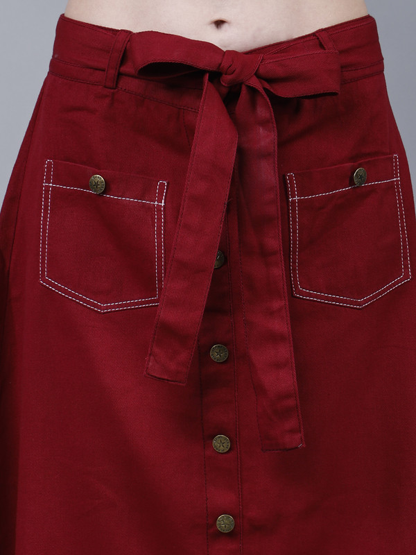 Solid midi A-line Marron Cotton skirt for Women, has a partially elasticated waistband, front slit, button closure, 2 front patch pockets, comes with a belt. Washed Premium Quality Denim.