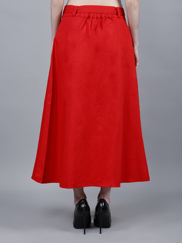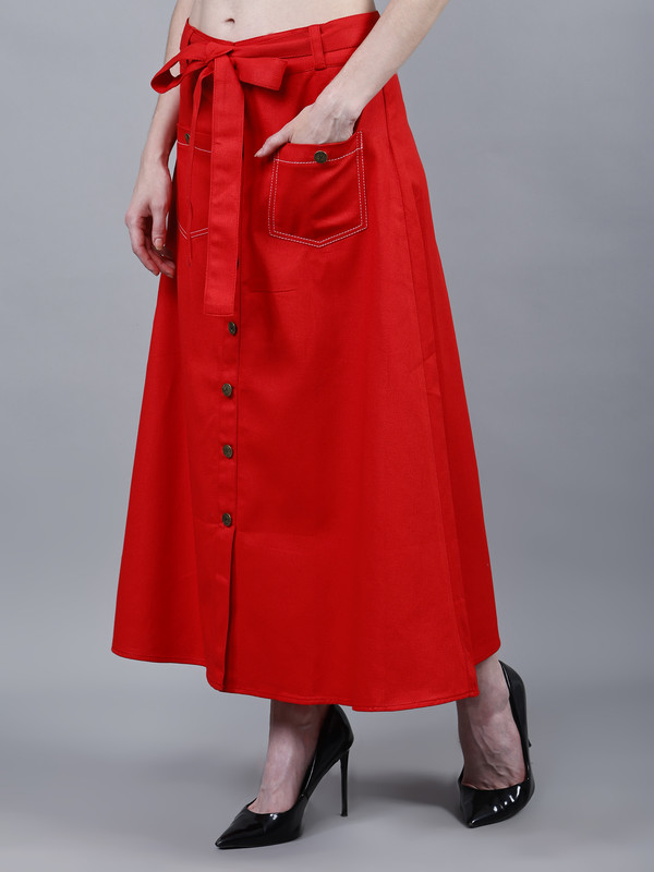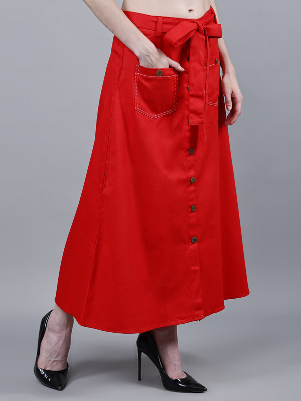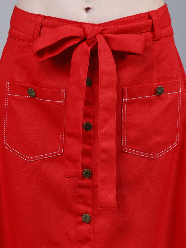 Solid midi A-line Red Cotton skirt for Women, has a partially elasticated waistband, front slit, button closure, 2 front patch pockets, comes with a belt. Washed Premium Quality Denim.